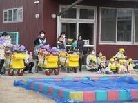 最後に遊具の引き継ぎをしました。そら組さんはバギーカー、つき組さんは三輪スケーター、ほし組さんはスケーターが使えるようになり、先生から使い方や約束を聞きました。