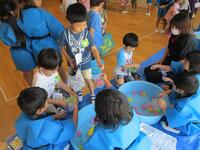 8月4日(金)に夏まつりを行いました。5歳児ほし組さんが、どんなお店にするか内容を考え、お面の色塗りをしたり、的あてのゲームを作ったりして当日まで準備を進めてくれました。