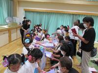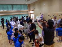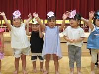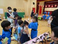 当日は各クラスで盆踊りをしてから、遊戯室でお買い物を楽しみました。0歳児ひよこ組、1歳児うさぎ組、2歳児ぱんだ組さんは、ほし組さんにプレゼントを届てもらい、それぞれの部屋で担任とのやり取りを楽しみながら、なつまつりの雰囲気を味わいました。