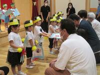 2~5歳児は発表の最後にプレゼントを渡しました。「いつもありがとう」「大好きだよ」など感謝の言葉を伝えながら渡すことができました。子ども達も、おじいちゃんおばあちゃんも最高の笑顔でした!