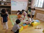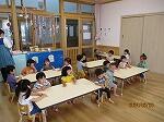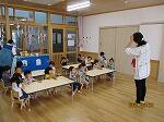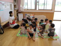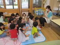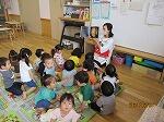 先生のお話しが大好きなさくら組さんです。手遊びや絵本、時々クイズも楽しんでいます。