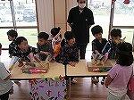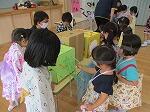 たくさんある紐の中から「どれにしようかなー」と考えながら紐を引っ張る子どもたち。おもちゃの水鉄砲をもらって、嬉しそうに受け取っていました。途中で、紐が抜けてしまうハプニングもありましたが、何とかみんなで協力して元通りに直し買い物を続けてもらうことができました。「ありがとうございました!」とお客さん一人一人に声をかけていた年長組さんです。