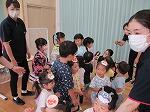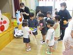 最初に、ひよこ組さんがお面を買いに行きました。「いらっしゃいませ~!」と年長組さんの掛け声が聞こえてきて、「どれにしますか?」と側に行って優しく声をかけてくれた年長組さん。アンパンマンのお面を被せてもらって嬉しそうなひよこ組の子どもたちでした。