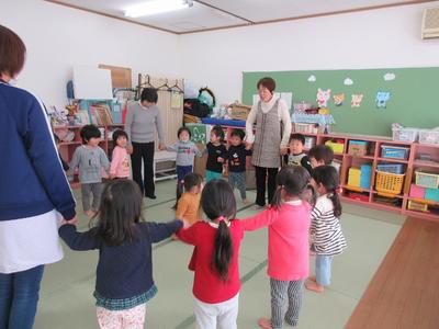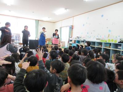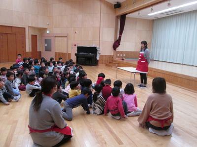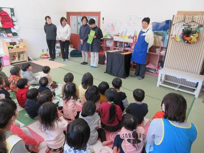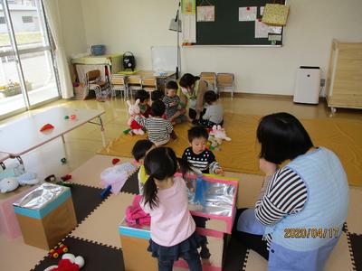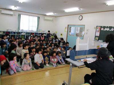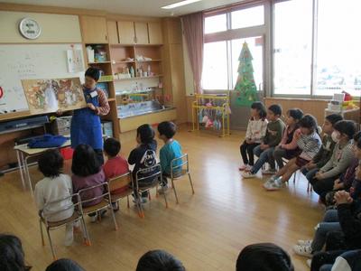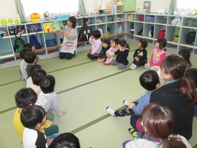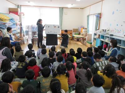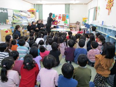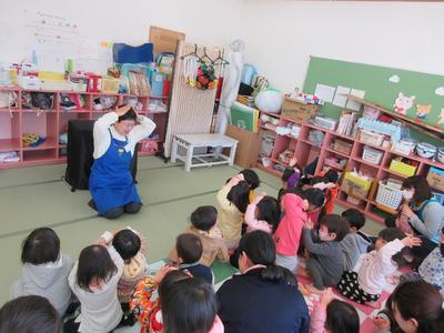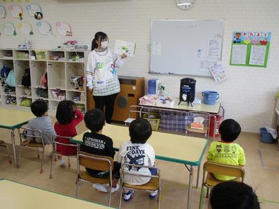 未満児、以上児、それぞれの年齢に合わせて、絵本、紙芝居、エプロンシアター、わらべ歌等をしてくださり、楽しい時間を過ごしました。