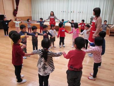 講師をお招きし、1・2歳児がわらべ歌の心地よいリズムを楽しみたっぷりふれあい遊びをしました。