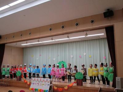 一人一人がセリフを覚えみんなで作り上げた言語劇。離れ離れになってもいつまでも友達、心を一つに表現しました