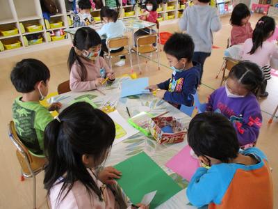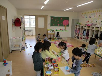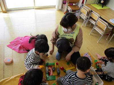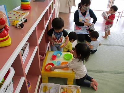 長いお休みで、もっと泣き声が響くかと思いきや、クラスに入り、先生や友達、環境に触れると、思い出したように遊びだすことができました。慣らし保育を経て、保育所が楽しい場所と感じられるようになっていたことを嬉しく思っています。保育所の生活リズムに戻しながら、みんなで活動を楽しめるよう、一人一人に寄り添いながら保育を進めてまいります。引き続き、感染予防にも努めてまいりますので、今後ともご協力をよろしくお願いいたします。