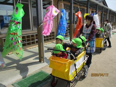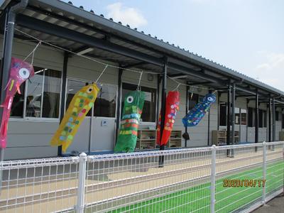 グループ活動にてこいのぼりを製作しました。外で元気に泳いでいます!