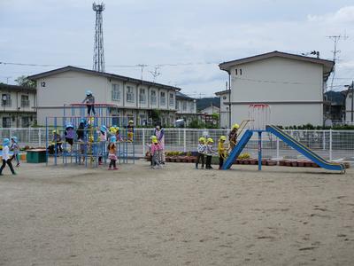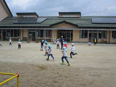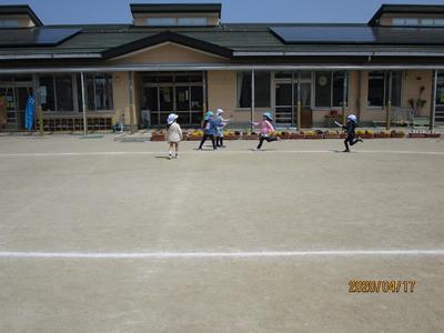 広い園庭で、リレーや鬼ごっこ、固定遊具などたくさん体を動かしています。