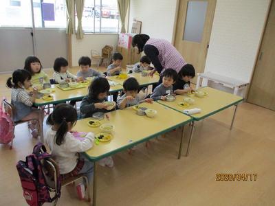 座って給食を食べることも上手です。今は、向かい合わせて食べないよう配慮しています。