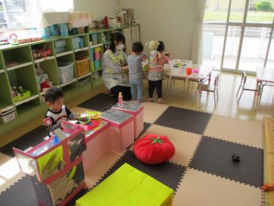 「アイスをどうぞ!」「ありがとう」 各コーナーに分かれて好きな遊びを楽しんでいます。