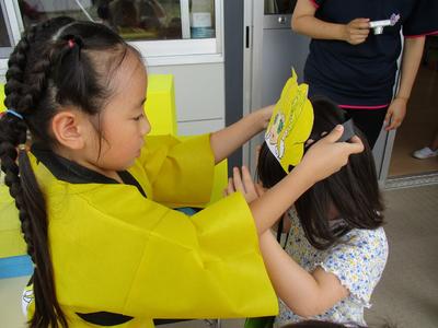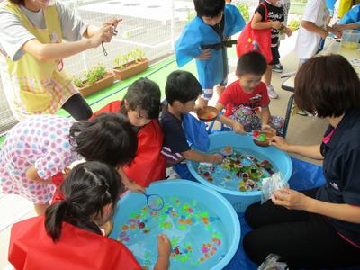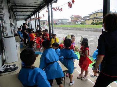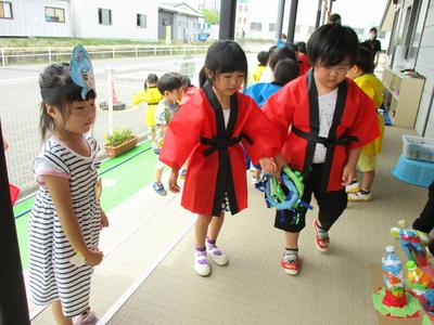 8月7日になつまつりを行いました。盆踊りを教えてくれたり、お店屋さんの準備をしたり、リードしてくれた年長組さん。当日も、「いらっしゃいませ!」「どれがいいですか?」と小さいお友達に優しく声をかけてくれて、みんなで夏のひと時を楽しむことができました。