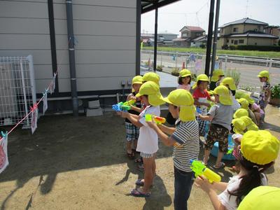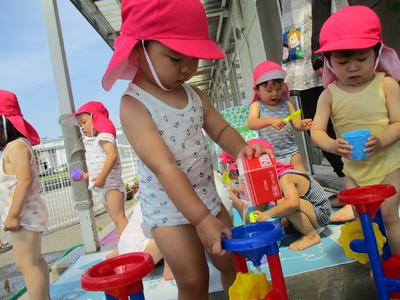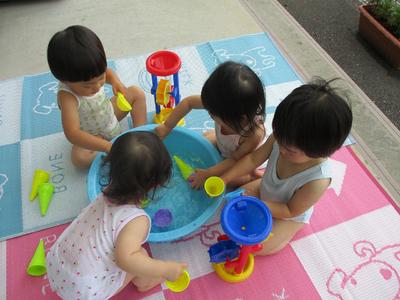 また、8月は水遊びも楽しむことができました。今年度は、新型コロナウイルス感染症の感染拡大防止のためプールには入らず、タライの水で遊びましたが、年齢に応じた遊び方で、水の感触を楽しみました。タオル、着替えのご協力、ありがとうございました。