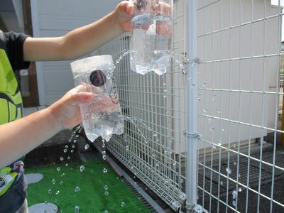 3歳児 ペットボトルの水シャワー、おもしろーい!