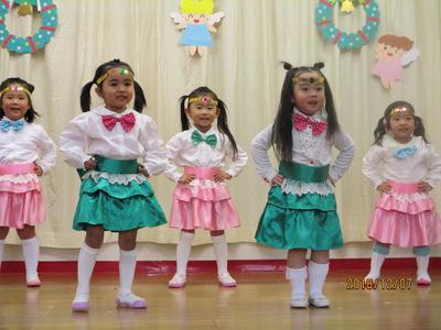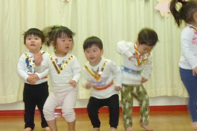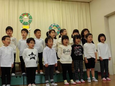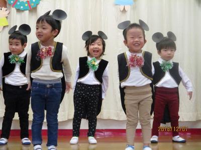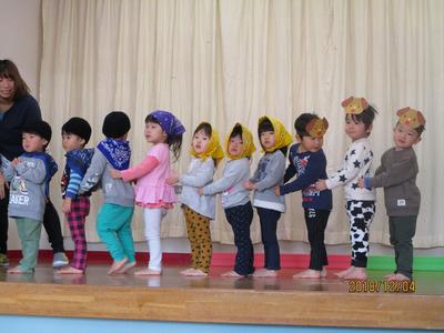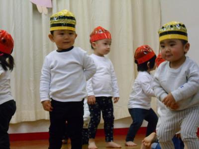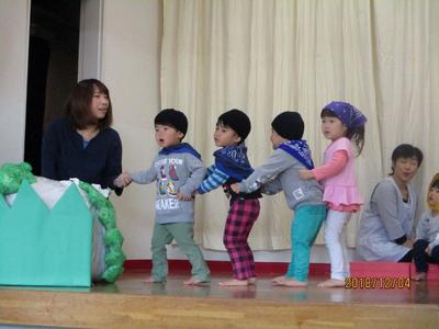 12月7日(金)に保護者の方をお招きし、おたのしみ会を行いました。1歳児から5歳児まで、全クラスの子どもたちがそれぞれの年齢にあった内容で、ステージ発表をしました。1歳児はクラスで楽しんで踊っている遊戯、2歳児は大好きな絵本のお話から発展した劇ごっこ、3歳児は隊形移動にも挑戦し気持ちを合わせての遊戯、4歳児は歌と役になり切って表現したリズム劇、5歳児は、一人一人が課題に向かって取り組みみんなで作り上げた、鍵盤ハーモニカ、合奏、言語劇、歌を発表しました。たくさんのお客様に緊張する姿も見られましたが、あたたかい拍手をたくさんもらってみんなうれしそうに満足した笑顔で終えることができました。大きな自信となり、次のステップへとつながる経験になったと思います。お忙しい中、ご参加くださいましてありがとうございまいた。