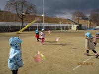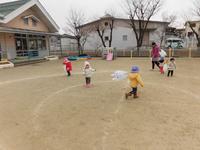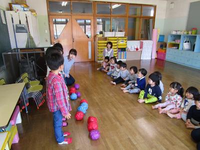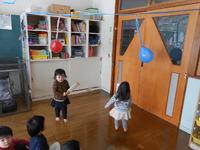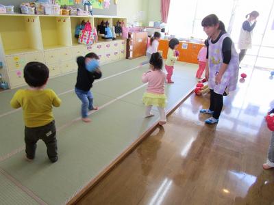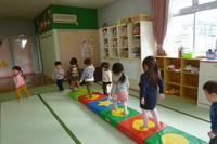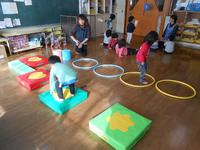 戸外では「おおかみさん」の鬼ごっこ、室内ではジャンピングマットや風船羽根つきをして体を動かして遊んでいます。「みんなで」や「順番」が分かってきてみんなで楽しむことができるようになりました。
