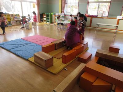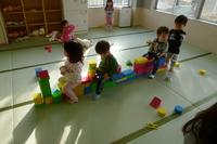 ソフト積み木をみんなでつなげてなが~い電車ができました! お買い物に行ってきます!とニコニコの子どもたち。言葉のやりとりをしながらお家を作ったり、みんなで体を動かしたりして楽しむ姿が見られています。