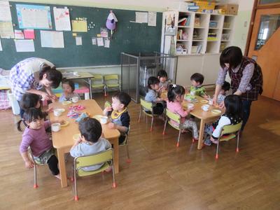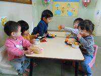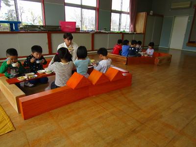 4・5歳児は遊戯室にて会食。いつもおいしい給食ですが、みんなで食べるとおいしさ倍増!おかわりもあっという間になくなりました。