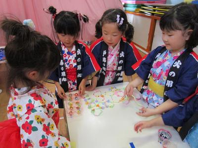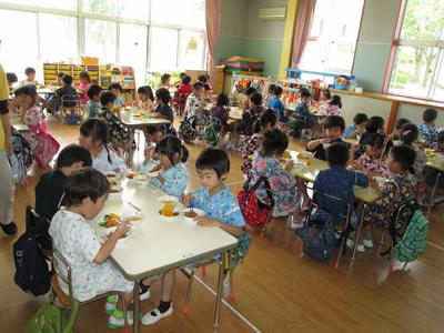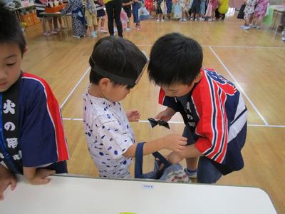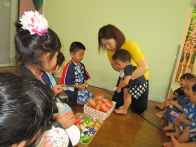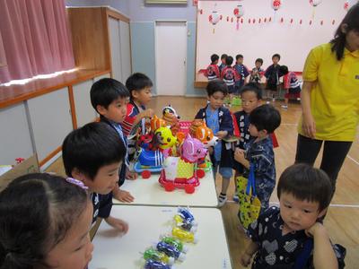 7月17日に夏祭りを行いました。年長組が計画を立てお店を開いてくれました。当日は朝から浴衣や甚平を着てきた子が多く、気分が高まり、始まるのをウキウキして待っている様子が見られました。残念ながら雨で遊戯室での盆踊りとなりましたが、とっても盛り上がり、楽しい1日となりました。浴衣や甚平のご協力、どうもありがとうございました。
