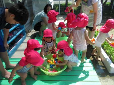 1歳児さんはテラスにて水遊び。じょうろに水を汲んだり、金魚すくいを楽しんだり、初めての水遊びでしたが、怖がることもなく大喜びでした。