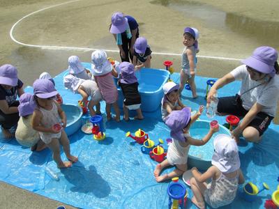 梅雨明けとともに、毎日暑い日が続いていますが、保育所の子どもたちは待ちに待った水遊びをおもいきり楽しむことができました。朝、タライやビニールプールに水を汲み準備していると「今日プール?」とニコニコ楽しみにしてる子どもたち。まぶしい太陽の下で、水の感触を楽しみ、嬉しそうな歓声と笑顔がキラキラ輝いていました。水着や下着、タオルの準備をありがとうございました。