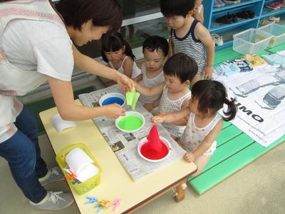 水遊びができない日に、ひたし染めに挑戦。クラスの壁面に、おいしそうなかき氷になって飾られています。