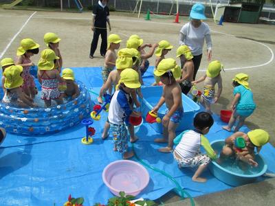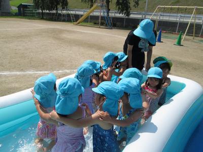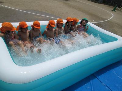 4歳児からは大きなビニールプール。初めに水の怖さも伝え、しっかり約束をしたことで安全にプール遊びを楽しむことができました。ワニ歩きや電車ごっこ、バタ足、顔洗いもみんなで楽しみました。
