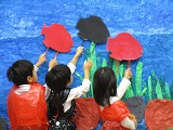 優しく教えてくれる5歳児さん。楽しそうに  壁面のツリーは型を抜いた