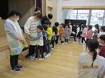 つばめさんがお部屋に来てくれて「保育所にようこそ!」「いっぱい遊ぼうね」と1歳児のひよこ組さんには、マラカスをプレゼントしました。グループごとに各クラスを訪問し、手作りボールやベルトなどをプレゼントしてくれました。