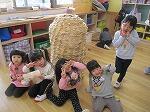 節分の豆まきでは、鬼に扮したつばめ組さんが怖くって動けなくなりましたが、廊下に出てくれたつばめ組さんに窓越しなら大きな声で掛け声を言ってできました。また、友達とやりとりをして遊べるようになりました。