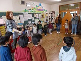 11月8日(水)はALT交流会があり、ジョイ先生から英語の「あいさつ」「歌」「動物」「形」などを教えてもらいました。