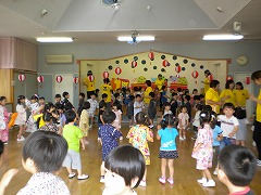 今年の夏祭りは、責任を持って取り組む姿・小さい子をやさしく面倒見ている姿・お兄さんお姉さんに面倒を見てもらいながら楽しそうに参加する姿など、子どもたちの、どの姿を見ても、保育所ならではの良さが見られた夏祭りでした。保護者の皆様の参加はありませんでしたが、子どもたちだけで行った夏祭りで、たくさんのことが体験でき、得たものも大きかったように思います。保護者の皆様にもその様子をお知らせします。