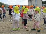 子どもたちに手をあげてもらい、大人が手を交差にてしっかり握って、子どもたちをくるっと回します。