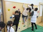 ボルダリングを楽しみました。4月からは小学生になります。いろんなことができるようになりました。コマ回し、縄跳びと友達や先生とどうやったらできるようになるかコツを伝え合い、共に成長してきました。