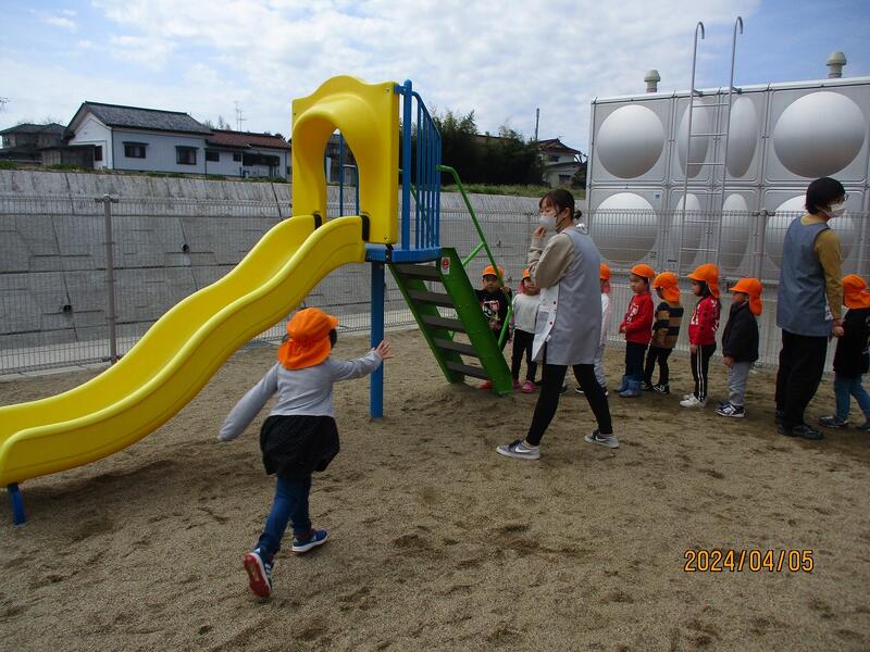 滑り台や遊具の遊び方をみんなと一緒に確認しました。