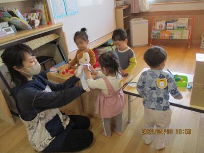 4月、ひよこ組に16名の子どもたちが入所しました。最初は泣いていた子どもたちも、先生と一緒に歌を歌ったり、興味を持った玩具を手に取って遊んでみたりするうちに、笑顔がたくさん見られるようになりました。