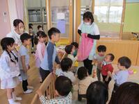 つばめさんがお部屋に来てくれて「保育所にようこそ!」「いっぱい遊ぼうね」と1歳児のひよこ組さんには、マラカスをプレゼントしました。グループごとに各クラスを訪問し、手作りボールやベルトなどをプレゼントしてくれました。