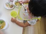 ままごと遊びが好きなあひる組の子どもたち。フライパンで目玉焼きを焼く真似をしたり、好きなおかずをお弁当に詰めたりしてイメージ遊びを楽しんでいます。
