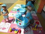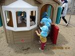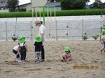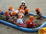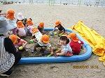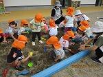 あひる組(2歳児)さんは、お友達と一緒に砂遊び、先生と一緒に道具の貸し借りをしながら、楽しく遊んでいます。
