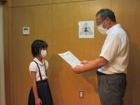 さいごに、6月に応募した「よい歯の書写コンクール」において優秀な成績をおさめた3年生入賞者(「特選」県審査出品です!)へ賞状を伝達しました。