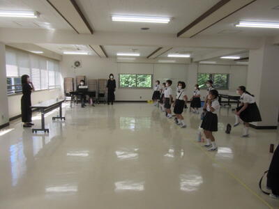 今日8月24日(水)の3校時、2年3組の子どもたちが、多目的室で音楽科の授業に取り組んでいました。