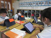 また、1組ではこの時間、タブレットの「メタモジ」を使って、一人一人が自分の考えをシートにまとめることや各自の考えをタブレットの画面上で共有することにも取り組みました。