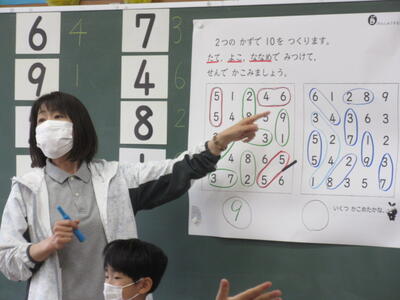 今日6月7日(火)の2校時、1年3組では、算数科「いくつといくつ」の学習で、2つの数を合わせて10をつくる問題にチャレンジしていました。