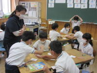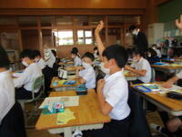 今日5月24日(火)の2校時(3の1)、3校時(3の2)、4校時(3の3)に、ALTのバイロン先生が入っての、外国語活動の学習が行われました。教育実習生の模範授業です。