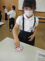 色紙や算数の数え棒、色板、おはじき等々、身近にあるものを並べてかたち作る「造形遊び」の学習です。