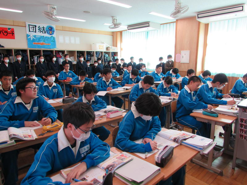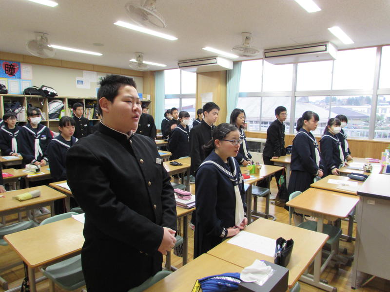 生徒会本部役員の進行で進みます。校歌も各教室でしっかり歌っていました。