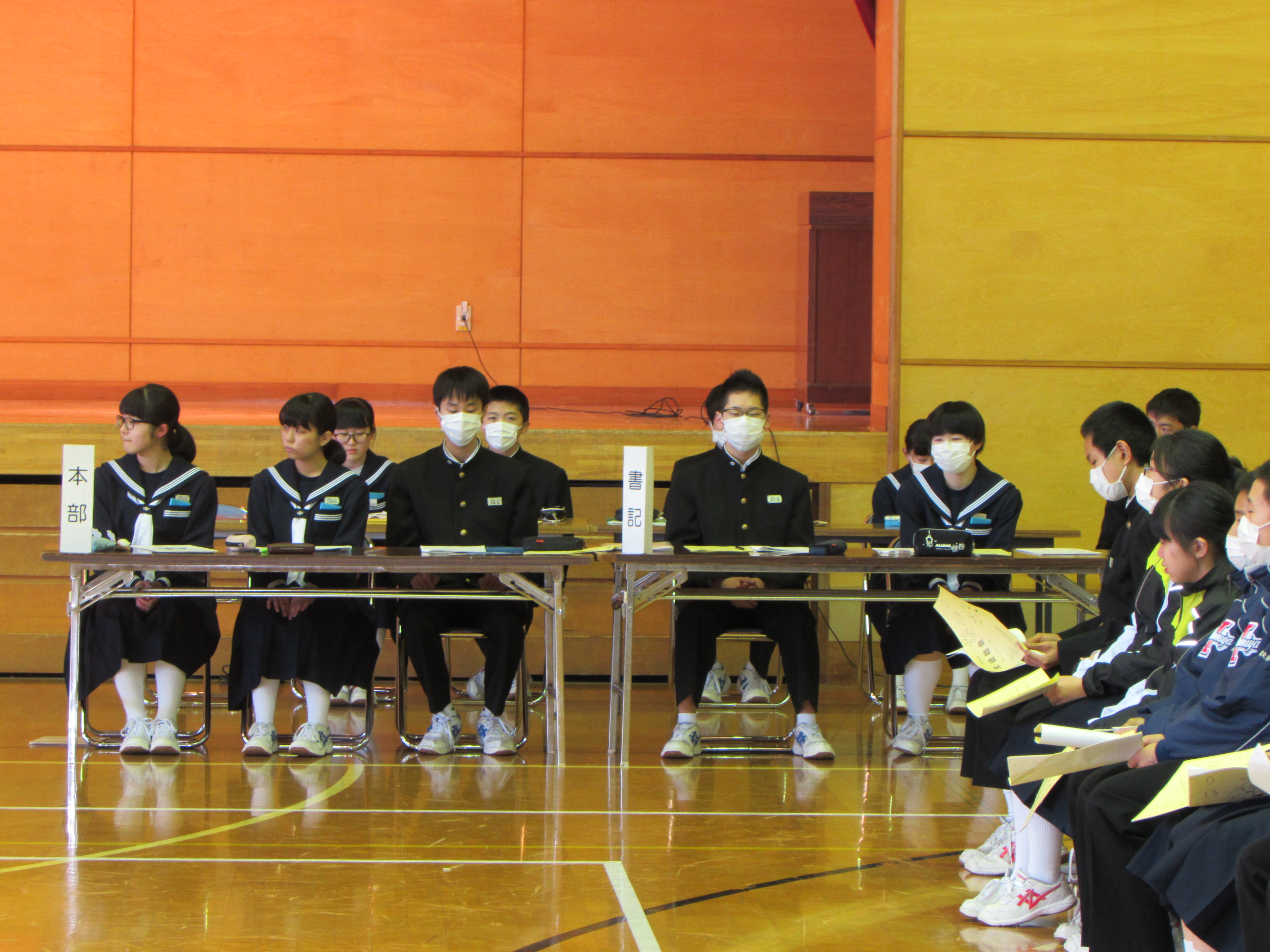 2年生の半田歩夢くん、阿部眞央さんが議長を務め、第1号議案生徒会本部活動報告から各員会活動報告、決算、第4号議案の会則の改正まで2年生を中心にしっかりと会が進められました。