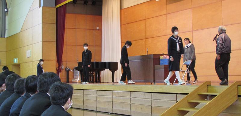 その頃3年生は、体育館で卒業式の練習をしていました。限られた時間での練習ということで、式の流れを確認して自分の動きを確認、実際に動いてみて・・・・。こちらも、集中をして一生懸命取り組んでいました。