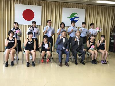 本日、本宮市役所議会場にて「東北大会出場報告会」が実施されました。本校からは2名が参加し、高松市長より目録(東北大会出場経費補助)及び記念品(まゆみちゃんぬいぐるみ、エコバッグ)を頂きました。市長からも力強い激励の言葉を頂き、選手の皆さんも決意を新たにしたところでした。東北大会は8月5日~7日に岩手県にて開催されます。県大会に引き続き、素晴らしい泳ぎができることを期待します。