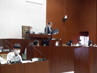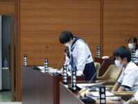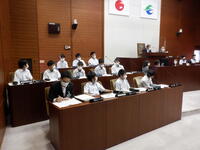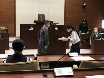 議会議長の三瓶裕司さんから「市議会議場を訪問してくれてありがとうございます」との言葉をいただき、生徒たちの素朴な質問に丁寧に答えていただきました。また、政策推進係長の武藤さんから市の取り組みや議会事務局の国分さんから議会の重要性などを教えていただきました。